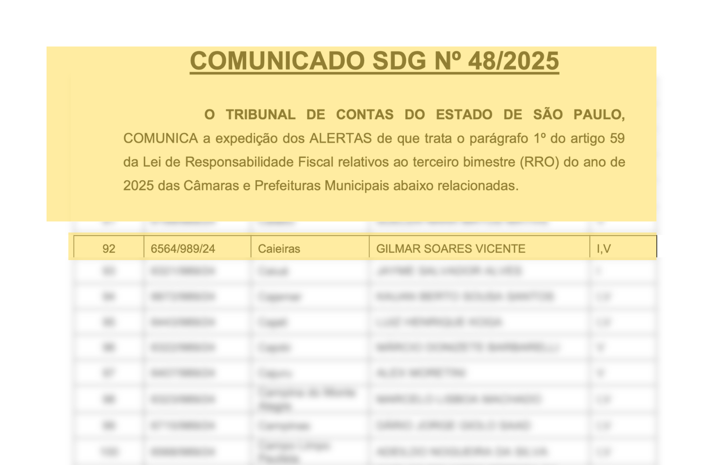 A Prefeitura de Caieiras, administrada pelo prefeito Gilmar Lagoinha (PL), foi incluída em uma lista de alerta do Tribunal de Contas do Estado de São Paulo (TCESP) devido a situações de risco nas finanças públicas do município. O comunicado SDG 48/2025, expedido em 12 de agosto, destaca pontos críticos que exigem atenção imediata da gestão para evitar futuras penalidades.