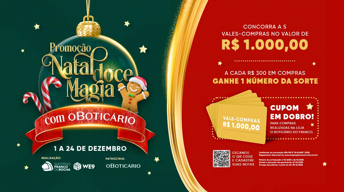O Shopping Franco da Rocha iniciou uma campanha de Natal que sorteará cinco vales-compra no valor de R$ 1 mil cada. A ação, denominada “Doce Magia com o Boticário”, tem como objetivo presentear os consumidores durante as compras de fim de ano.